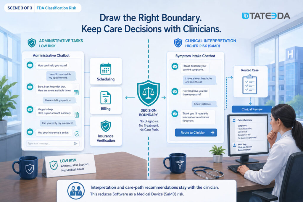 Symptom triage that generates a recommendation based on clinical criteria sits in FDA classification risk territory. Administrative chatbots that handle scheduling, billing inquiries, and insurance verification are generally outside SaMD scope. The architectural implication: a triage chatbot should collect symptoms and route to a clinician for interpretation, not generate the interpretation itself. Building that boundary into the system architecture — not just the terms of service — is what keeps it outside FDA regulatory scope.