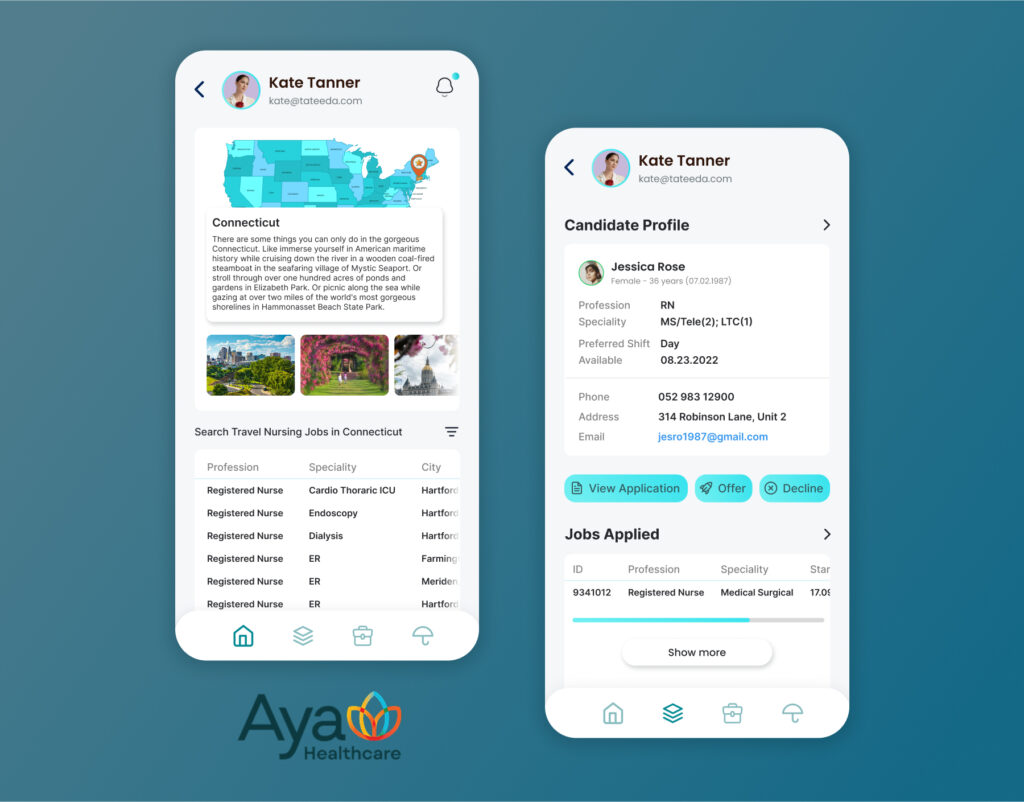 AYA Healthcare: We designed and created three distinct mobile apps (workspaces for different user groups) to support their large web-based travel nurse management platform with a great range of functions/features.