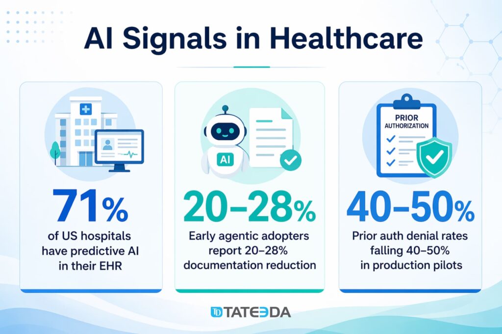 71% of US hospitals reported predictive AI integrated with their Electronic Health Record (EHR) in 2024, up from 66% the year before. The organizations now moving to agentic AI — one tier above predictive AI in autonomy and workflow scope — are reporting 20–28% reductions in documentation time and measurable drops in prior authorization denial rates. Those waiting are falling behind in physician satisfaction, payer performance, and administrative cost per encounter.