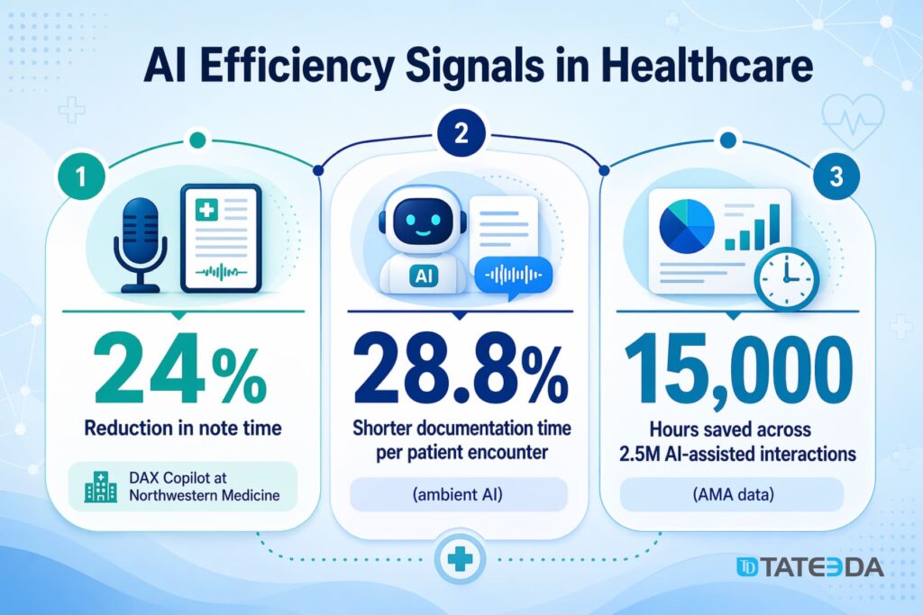 The most mature agentic AI use case in healthcare is ambient clinical documentation, and the outcomes data is substantial. Microsoft’s DAX Copilot deployment at Northwestern Medicine produced a 24% reduction in time spent on clinical notes and a 17% reduction in after-hours documentation. Across 2.5 million AI-assisted interactions tracked by the American Medical Association (AMA), total time savings across participating organizations reached 15,000 hours. A separate analysis found a 28.8% reduction in documentation time per patient encounter.