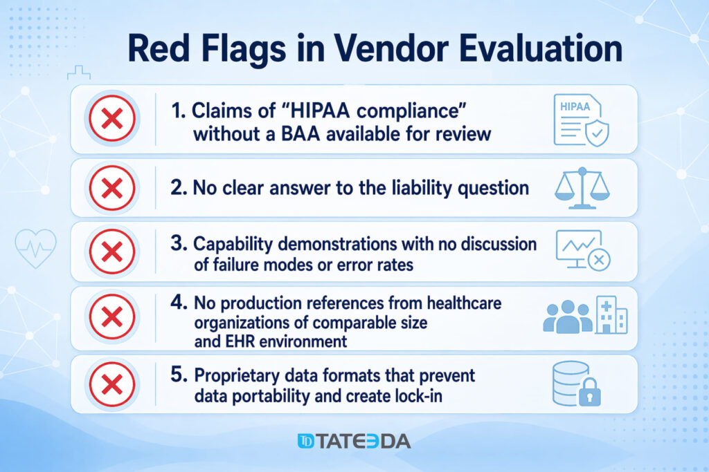 A vendor claiming “HIPAA compliance” without a BAA available is not HIPAA-compliant for your purposes. A vendor whose BAA scope excludes AI model training data — meaning your PHI may be used to retrain or fine-tune their model — has a significant contractual gap your compliance team needs to evaluate before signature.